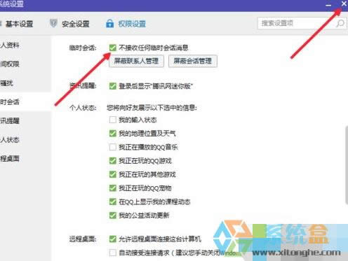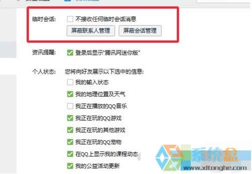 6、這時(shí)候我們可以看到會(huì)有一個(gè)臨時(shí)會(huì)話(huà)的選項(xiàng)框,我們將“不接受任何臨時(shí)會(huì)話(huà)消息”勾選。
