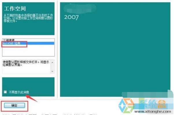 1、首先我們打開AutoCAD這個(gè)軟件,在打開時(shí)會讓我們選擇工作空間,選擇AutoCAD經(jīng)典即可,可勾選下方的“不再顯示此類消息”,然后點(diǎn)擊確定保存設(shè)置。