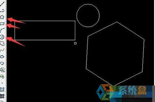 3、我們可以先按照圖示箭頭所指示的工具欄,按順序畫出矩形、圓、多邊形繪圖。