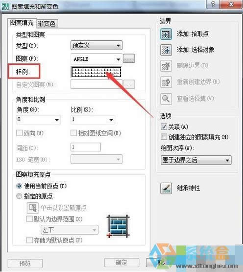 5、點(diǎn)開后會有一個(gè)“圖案填充和漸變色”窗口,點(diǎn)擊箭頭處所指“樣例”,在彈出的窗口里面找到“WOOD”圖樣,這個(gè)圖案就是我們常用的剖面線的樣式,點(diǎn)擊確定。