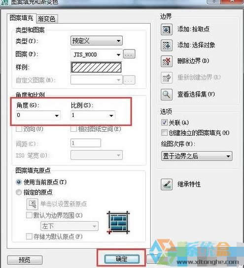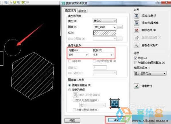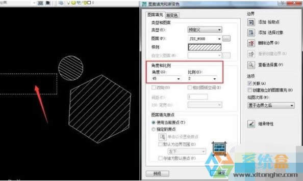 7、回車后剛才的圖案填充窗口和漸變色會再次彈出來,在角度和比例處不更改設(shè)置,點(diǎn)擊確定,這時(shí)候我們就能將選中的圖案打上剖面線。