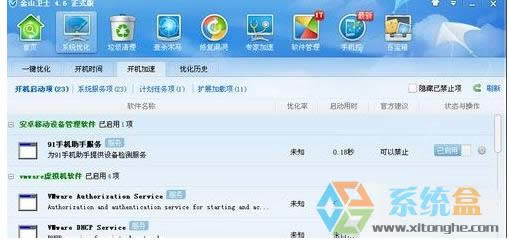 打開金山衛(wèi)士,在系統(tǒng)優(yōu)化-開機(jī)加速里可以對(duì)一些無關(guān)緊要的程序進(jìn)行啟動(dòng)禁止。