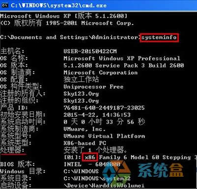 第三步、在彈出的命令行中輸入“systeminfo”并按回車鍵確定,稍等片刻會顯示出系統(tǒng)各類信息,找到“處理器”字段進行查看相應信息,如果顯示X64則CPU為64位,若顯示X86則為32位。如下圖所示: