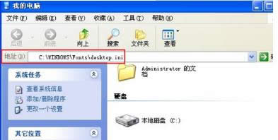 一旦遇到這種問題,首先打開我的電腦,在地址欄中輸入C:\WINDOWS\Fonts\desktop.ini。