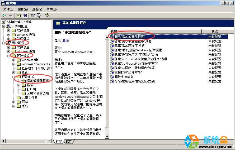 3、在打開的“組策略”窗口左側(cè),依次展開“本地計算機策略”---“用戶配置”---“管理模板”---“控制面板”---“添加或刪除程序”---在窗口的右側(cè)找到“刪除‘添加或刪除程序’”項;