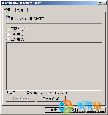 4、雙擊“刪除‘添加或刪除程序’”會彈出“刪除‘添加或刪除程序’屬性”界面,選擇“未配置”或者“已禁用”,點擊“確定”,然后重啟電腦。