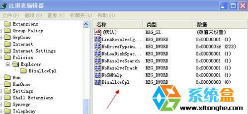 3、打開“注冊表編輯器”后,在左側(cè)依次打開“HKEY_CURRENT_USER\Software\Microsoft\Windo ws\CurrentVersion\Policies\Explorer”,并刪除右側(cè)的“DisallowCpl”項,然后重啟電腦。