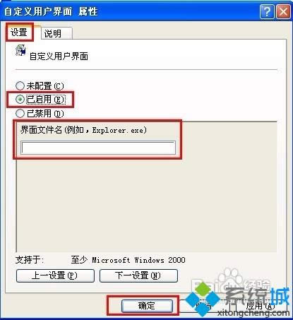 5、在彈出的“設置”選項卡下選擇“已啟用”,在界面文件名框中鍵入想要系統啟動時加載的程序,單擊“確定”。